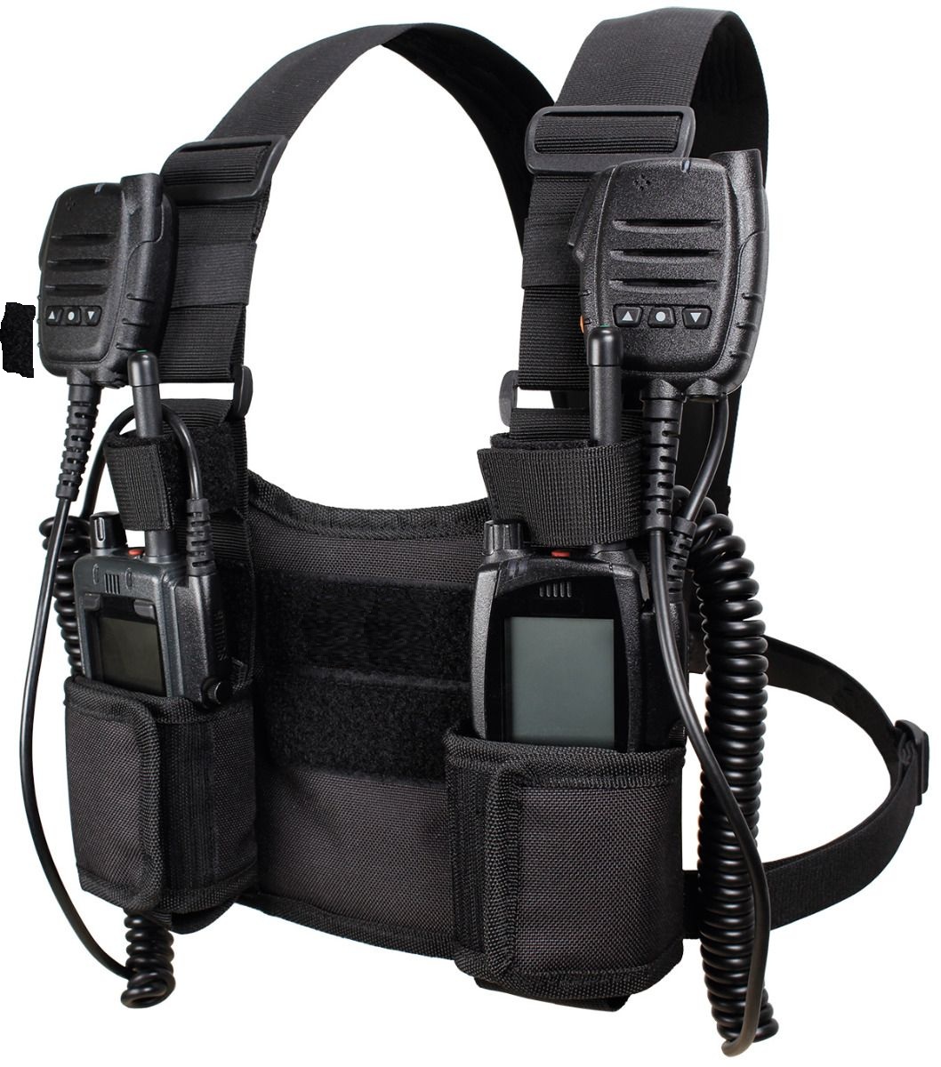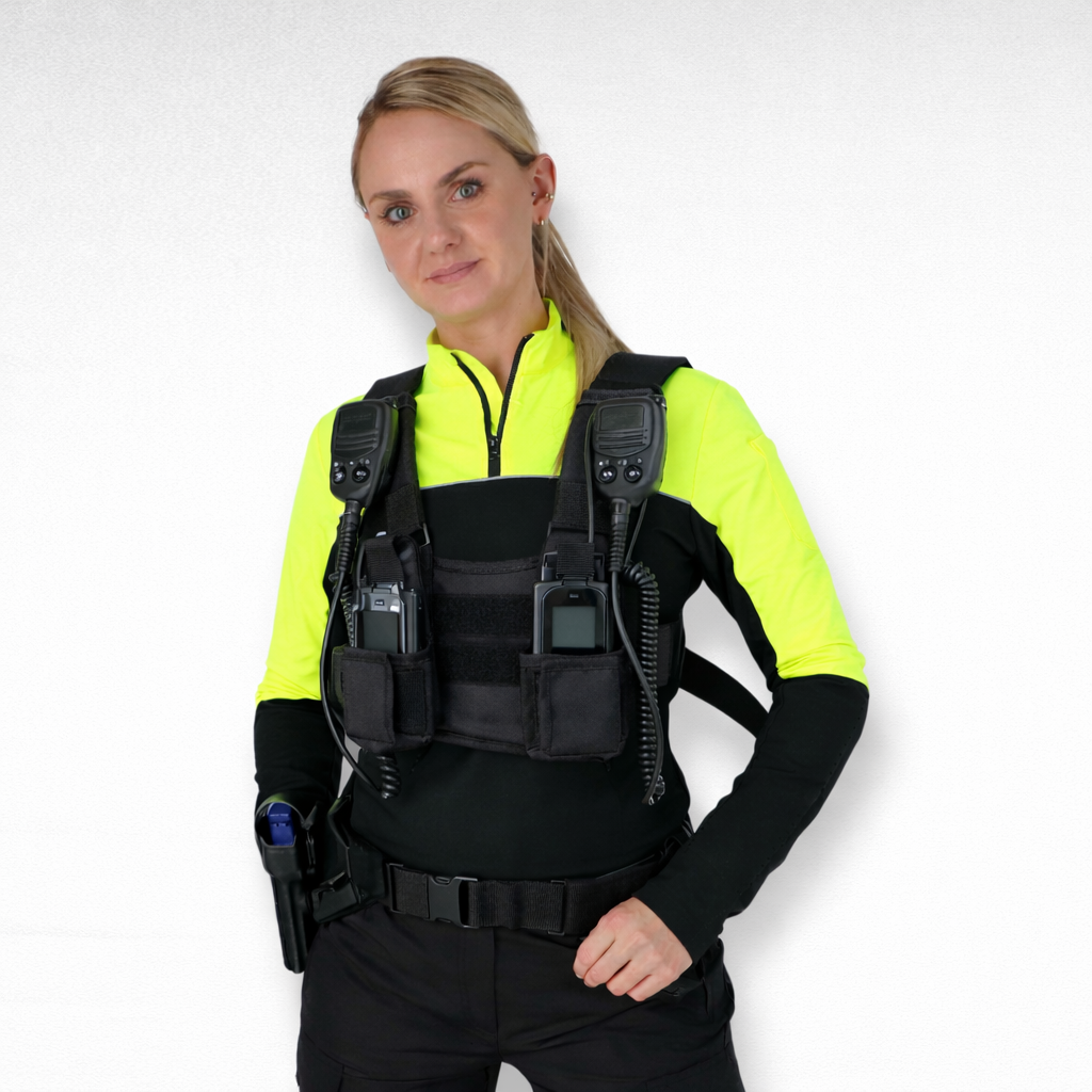 Komfortables Tragegeschirr für bis zu zwei Funkgeräte oder alternative Einsatzmittel.