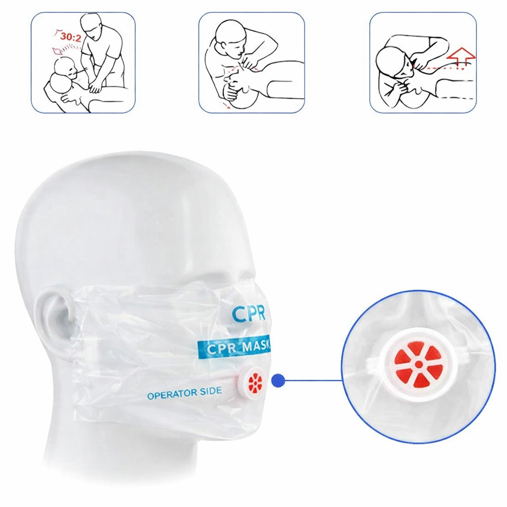 Beatmungsfolien mit Einwegventil ausgestattet, welches die Atemluft nur in Richtung des Patienten strömen lässt. Durch die Gummischlaufen verbleibt die Maske auch während der Herzdruckmassage stets in der korrekten Position.