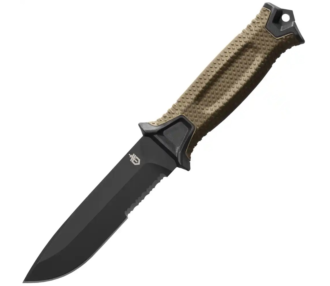 Das Gerber Survivalmesser Strongarm SE ist ein zuverlässiger Begleiter für Outdoor-Abenteuer und Überlebenssituationen. Ausgestattet mit einer Vollerl-Klinge aus hochwertigem 420 HC rostfreiem Stahl, bietet es außergewöhnliche Haltbarkeit und Schneidleistung. Die gewellte Schneide ist ideal für das Durchtrennen von Seilen und anderen Materialien, während die keramische Klingenbeschichtung zusätzlichen Schutz vor Korrosion bietet.